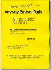 Im Raum Limburg genoss die Disco Anyway über zwei Jahrzehnte einen Ruf, der Generationen ausgehwütiger Menschen anlockte. Vor einigen Jahren war dann Schluss damit. Traf man zufällig irgendwo alte Bekannte aus der Zeit, begann die Schwärmerei. "Ach, waren das noch Zeiten im Anyway, schade, dass es das nicht mehr gibt." Am 30.12.2007 wird nun ein Versuch gestartet, die alte Stimmung noch einmal aufleben zu lassen. Sagt nachher nicht, Ihr hättet es nicht gewusst und vor allem: Riskiert nicht bereuen zu müssen, die Party verpasst zu haben. Und keine Angst: "Soul, Funk und Co" (s.u.) meint eigentlich Rock-Musik. Wir sehen uns also am 30.12. in Staffel.